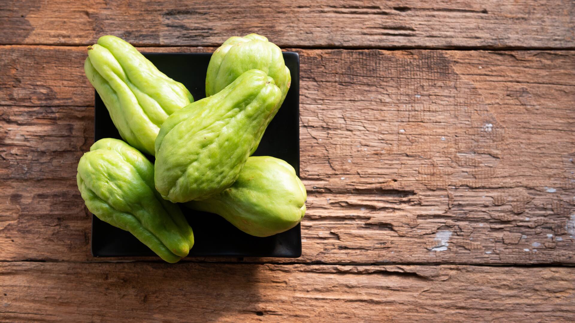 Die Chayote (auch unter dem Namen Stachelgurke bekannt) ähnelt sowohl in Form als auch in Größe der Birne. Die Schale ist je nach Sorte hell- bis dunkelgrün, glatt bis wellig und manchmal weich bestachelt. Im Inneren befindet sich ein großer, glatter Kern, der zwar genießbar ist, aber normalerweise nicht mitgegessen wird.