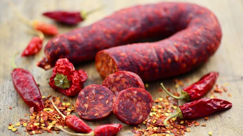 Chorizo ist eine spanische luftgetrocknete Rohwurst, die aus Schweine- oder Kalbfleisch, Speck, Salz, Gewürzen und vor allem Paprikapulver besteht. In der Herstellung ist sie der Salami sehr ähnlich und wird ebenso mehrere Wochen an der Luft getrocknet.