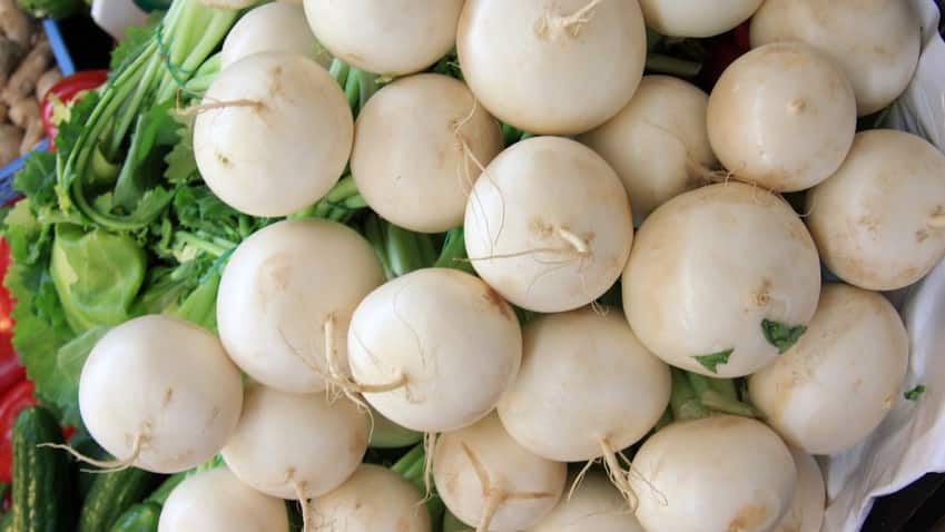 Ab März werden frische Sommerrettiche verkauft, die Saison geht bis September. Ein noch gesundes Laub deutet auf frische Ware hin.