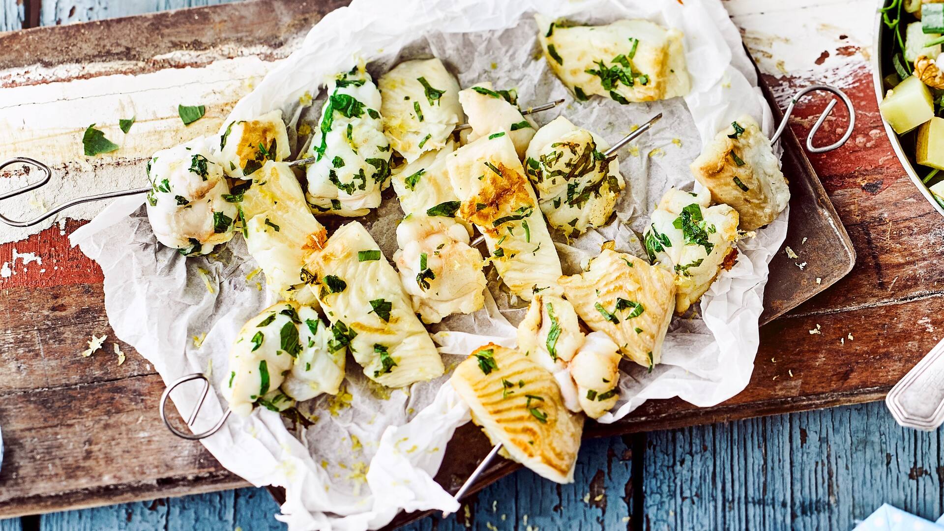 delikaten Fischspieße etwa können Sie auch Leng verwenden. Beim Zubereiten von Lengfisch ist das richtige Filetieren wichtig, um die Gräten auch bei kleinen Exemplaren einfach entfernen zu können. Teilen Sie das per V-Schnitt entfernte Filet an der dicken Stelle und schneiden Sie dann die Gräten weg. Die dünnen Filets sind paniert und in Butter ausgebraten ein Genuss – und lassen sich übrigens auch gut zu