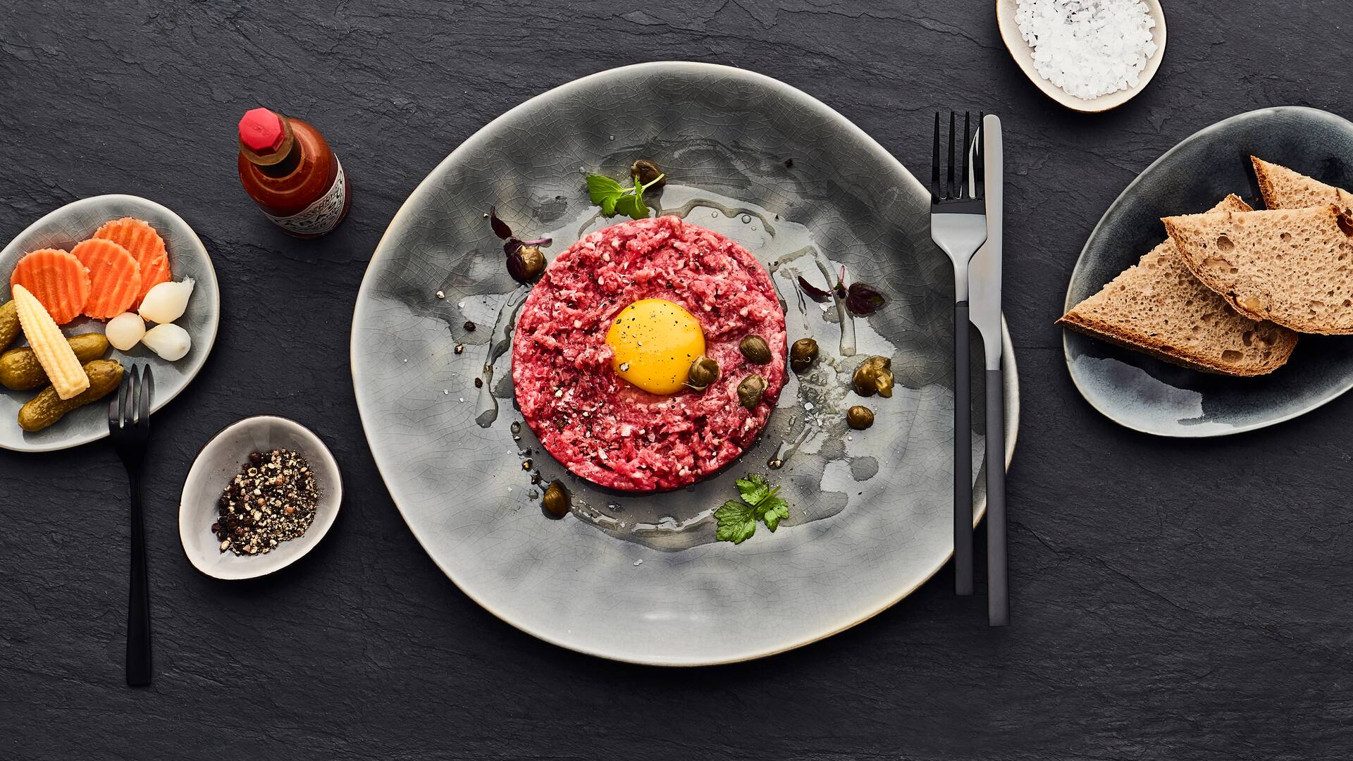 Nach traditioneller Art geht es sehr schnell, Schabefleisch zuzubereiten. Das Tatar wird einfach mit Salz, Pfeffer, rohem Eigelb, gehackten Zwiebeln, Sardellenfilets und Kapern vermischt. Zum Würzen von Schabefleisch eignen sich Senf, Worcestersoße, Tabascosoße, Sojasoße, Chilisoße und Ketchup sehr gut – probieren Sie verschiedene Mischungen aus. Die genaue Vorgehensweise bei der Zubereitung beschreibt unser