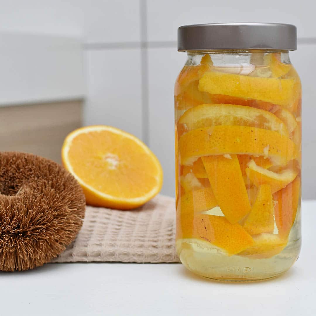 Viel brauchen Sie nicht, wenn Sie Orangenreiniger selbst herstellen wollen. Es genügen die Schalen von rund zehn Bio-Orangen, eine Flasche Essig, beispielsweise Apfelessig, dazu ein Einmachglas, ein Sieb, eine Flasche mit Zerstäuber, eventuell etwas Flüssigseife. Steht alles bereit, geben Sie die Zeste in das Einmachglas und füllen es danach bis oben hin mit Essig. Jetzt lassen Sie alles rund zwei bis drei Wochen an einem kühlen Ort ziehen. Saugen die Orangenschalen viel Essig auf, können Sie etwas nachgießen. Um Schimmelbildung zu vermeiden, sollten die Schalen immer bedeckt sein. Dunkle Flüssigkeit bedeutet, dass der Orangenreiniger bereit ist. Nun gießen Sie ihn durch ein Sieb in die Pumpflasche. Ein TL Flüssigseife erhöht die Haftung des Reinigers auf glatten Oberflächen. Mit dieser Anleitung können Sie also ganz einfach