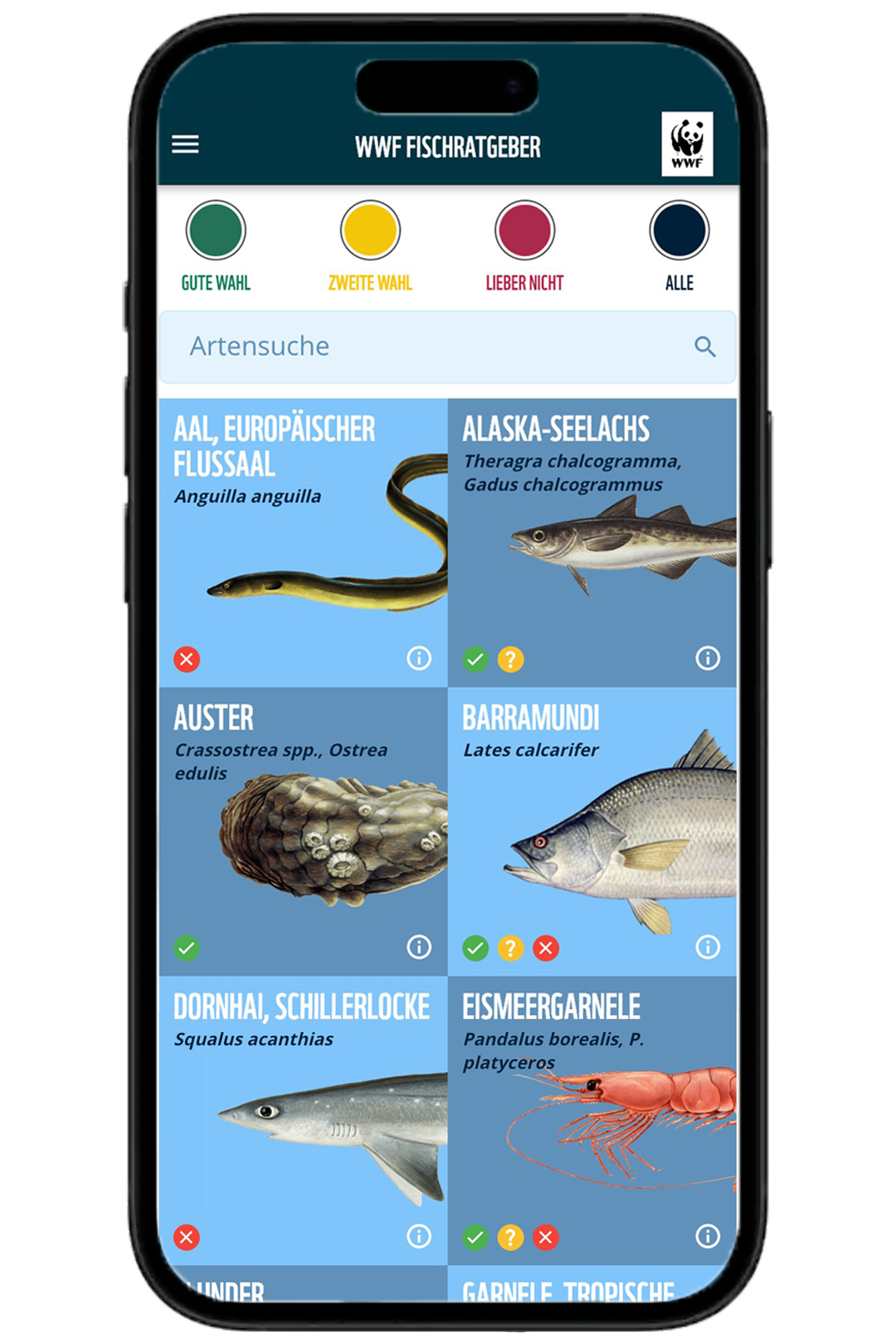 • Eine grüne oder gelbe Bewertung im WWF Fischratgeber