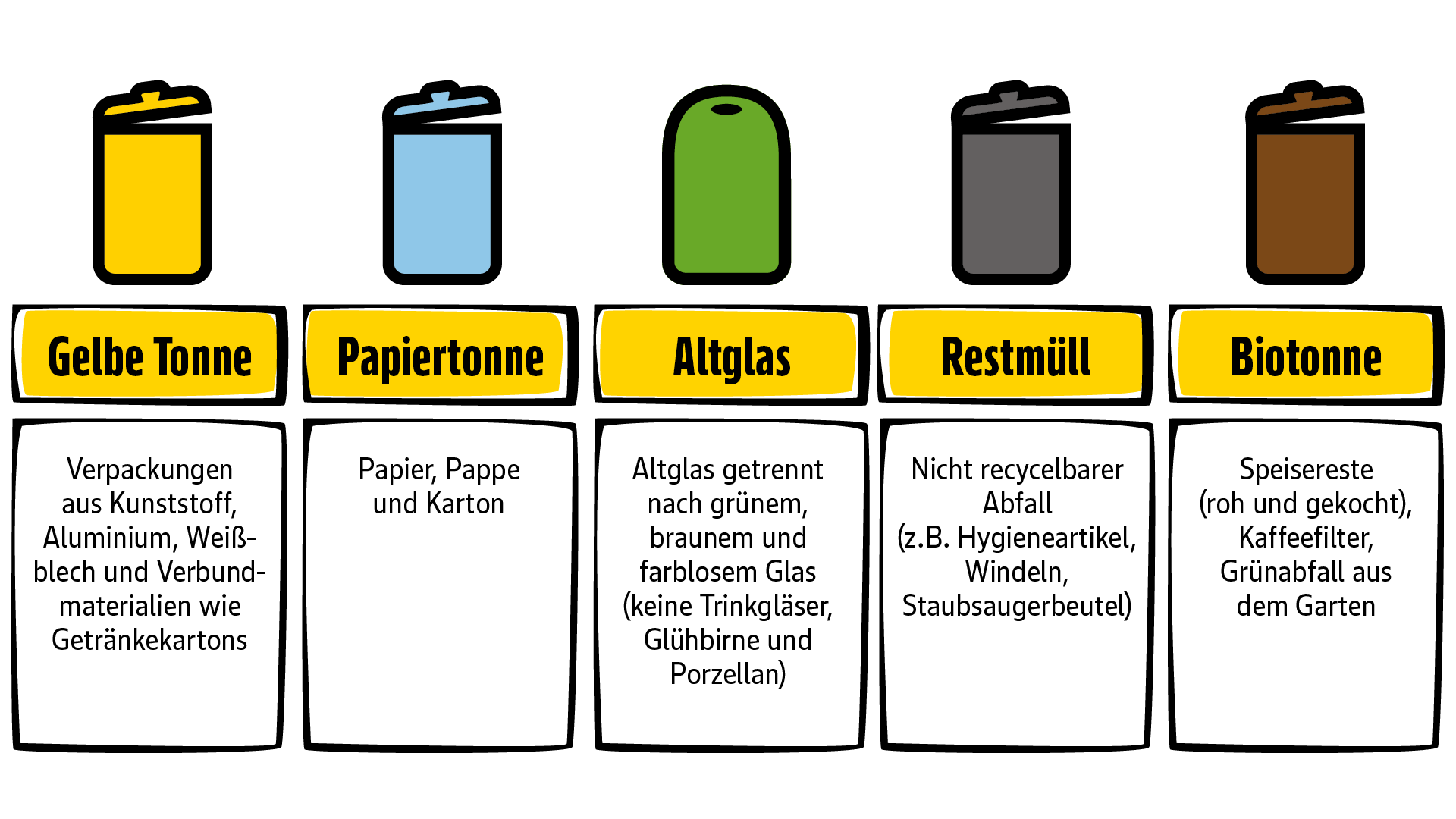 Alle LebensmittelMüll belastet unsere Umwelt – jede:r Deutsche verursacht im Schnitt 476 kg pro Jahr, das entspricht etwa 2.380 Tomaten. Doch wohin mit dem Abfall? Restmüll, Biomüll, Papier, Glas oder Plastik zählen zum Haushaltsmüll, für den es individuelle Entsorgungswege gibt. Wir zeigen, wie du richtig trennst!