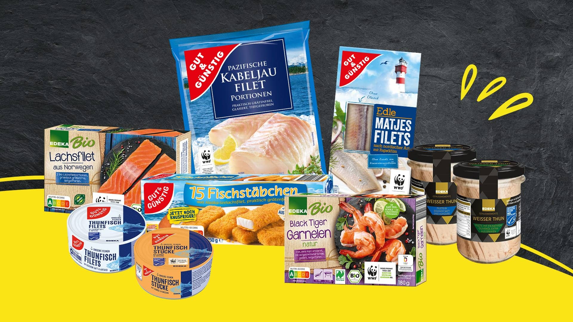 Sagen Sie beim Einkauf von nachhaltigerem Fisch "Ja!" zu unserem Sortiment mit dem WWF-Panda, dem Zeichen für umweltfreundliche Produkte. Den WWF-Panda müssen sich Fisch- und Meeresfrüchteprodukte verdienen, indem sie bereits mindestens mit Nachhaltigkeitskennzeichnungen wie dem MSC-Siegel (für Wildfisch) ausgezeichnet sind. Aber: Der Panda kennzeichnet nicht alle zertifizierten Produkte – sondern nur diejenigen aus Fischereien, die WWF auch für gut befindet. Ein weiterer Standard sind Bio-Siegel für Fisch aus Aquakultur, die mindestens die Richtlinien von Bioland oder Naturland erfüllen. All diese