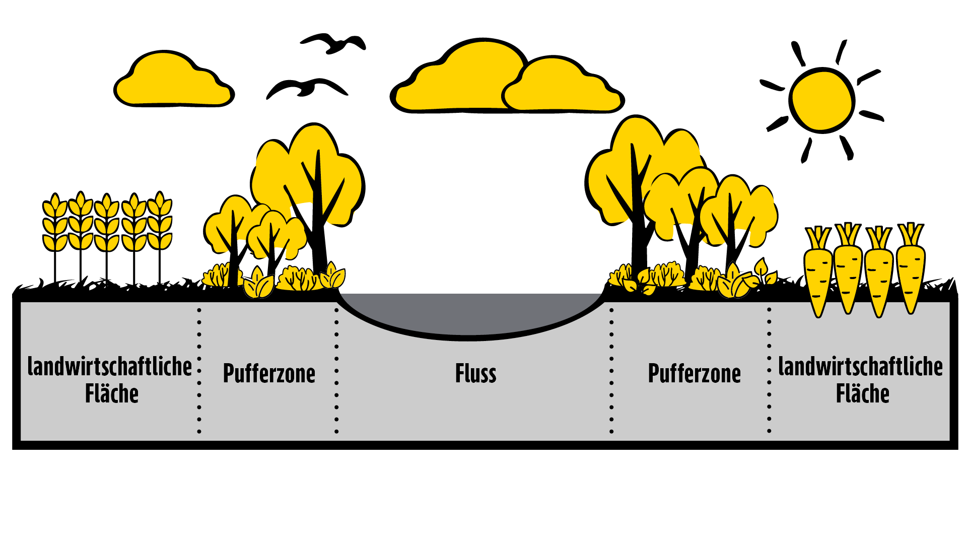 Durch einen natürlichen Abstand zwischen landwirtschaftlicher Fläche und Gewässer wird eine Verschmutzung (z.B. durch Dünge- oder Pflanzenschutzmitteleintrag) des Wassers vermieden.