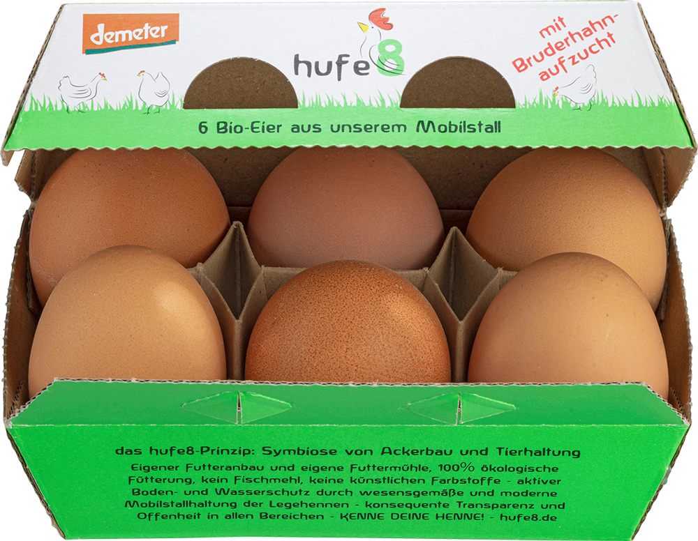 Unsere Produkte werden ganzheitlich unter unserem Namen vermarktet. Somit erkennen Sie, ob das Huhn, Ei oder Bruderhahn von der hufe8 stammt. Es liegt uns am Herzen, dass nicht nur die Eier in Ihren Küchentopf gelangen, sondern auch das Suppenhuhn und der Bruderhahn. Denn ohne Huhn und Hahn gäbe es auch kein Ei. Unser Rindfleisch findet über unseren Hofladen den Weg zu Ihnen. In unserer hufe8-Kartoffeltüte werden Sie ausschließlich Kartoffeln finden, die auf unseren Feldern gewachsen sind.