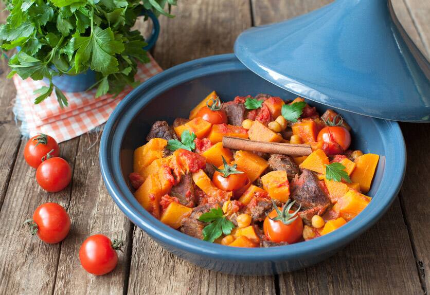 Lamm-Gemüse-Tajine aus. Dabei brätst du mit Knoblauch, Kurkuma und Ingwer kräftig gewürztes Fleisch und Gemüse in einem landestypischen Schmortopf – dem Tajine – an. Ein weiteres traditionelles Gericht sind Mantu, deftige mit Lammfleisch und Zwiebeln gefüllte Teigtaschen.