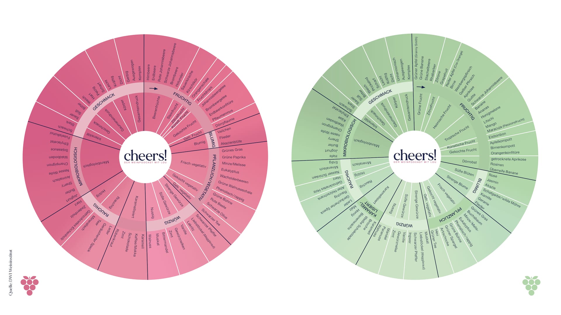 Egal ob Apfel, Tabak oder Stein: Das Weiß- und Rotweinrad beinhaltet verschiedene Aromen, welche bei der Weinprobe für die sensorische Beschreibung von Weinen hilfreich sein kann. Das Aromarad hilft dabei, Gerüche und Geschmäcker wahrzunehmen und sich an einer breiten Palette von Aromen zu bedienen.