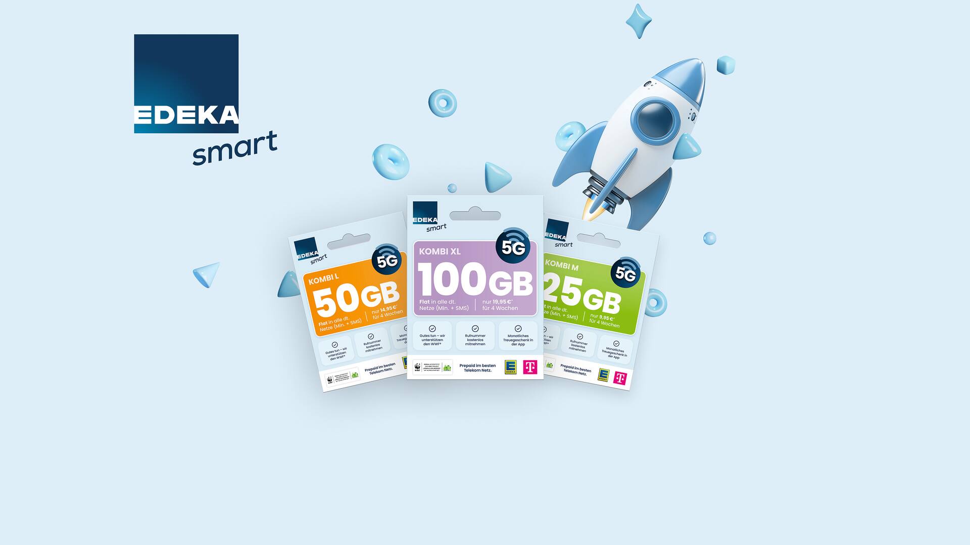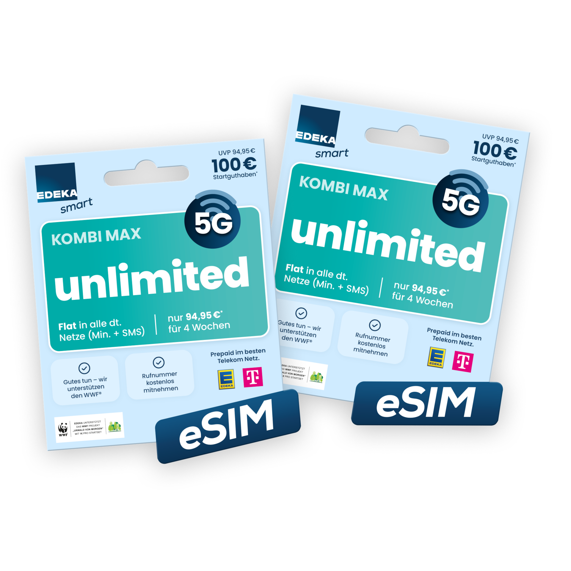 • EDEKA smart kombi XL kostet 94,95 € für 4 Wochen und enthält eine Telefon und SMS Flat in alle dt. Netze – jeweils auch im EU-Ausland ohne Zusatzkosten nutzbar. Mit unbegrenztem Highspeed-Volumen mit bis zu 100 Mbit/s und 5G.