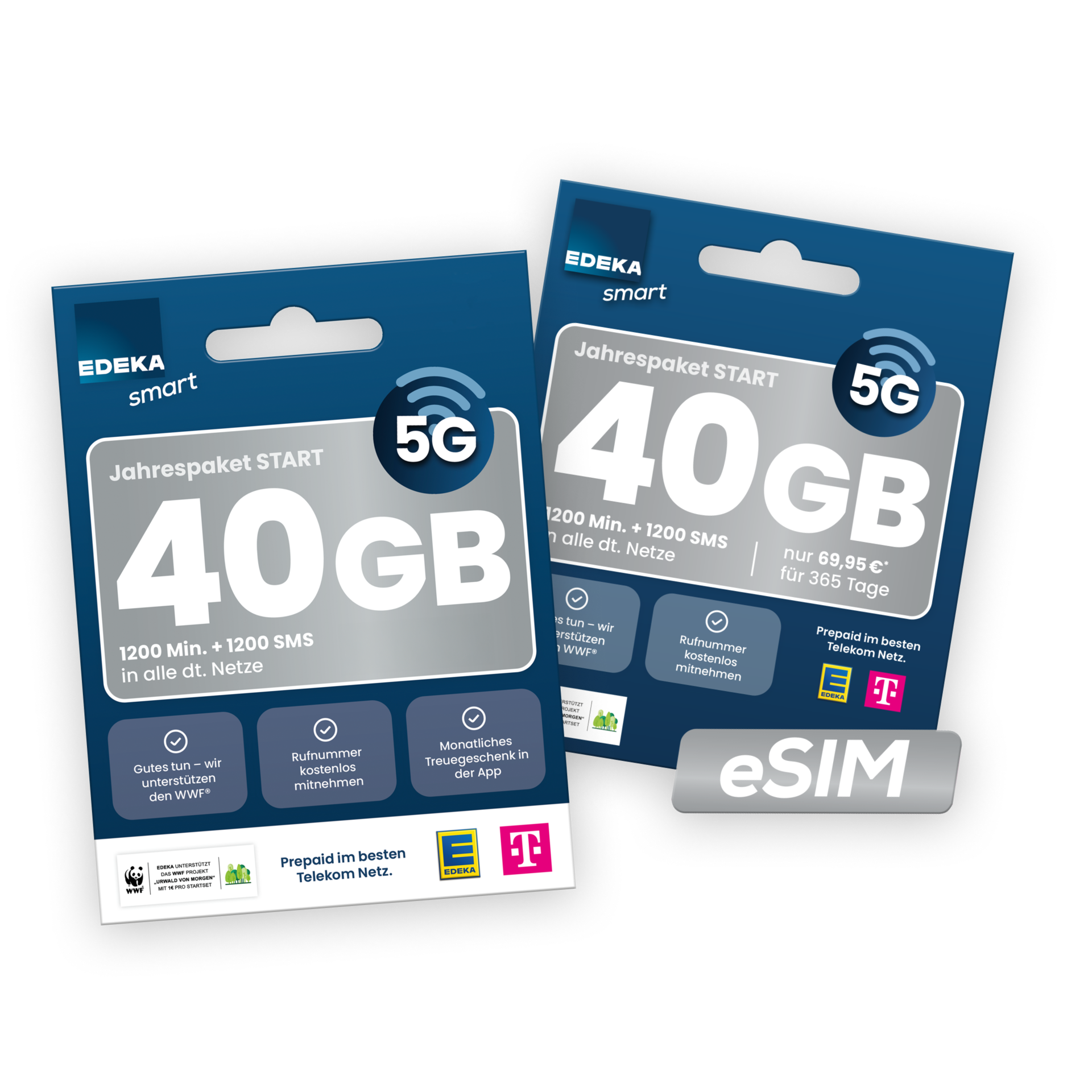 • Das EDEKA smart Jahrespaket Premium kostet 94,95 € / 1 Jahr und enthält 1 Jahr lang jeden Monat: 13 GB Highspeed-Volumen mit bis zu 100 Mbit/s und 5G (danach max. 32 KBit/s im Download und max. 16 KBit/s im Upload) und eine Telefon und SMS Flat in alle dt. Netze.