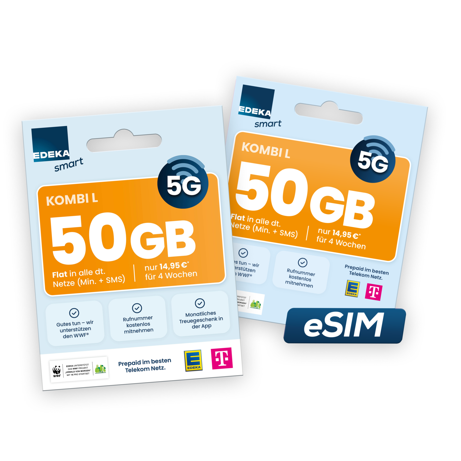 • EDEKA smart kombi L kostet 14,95 € / 4 Wochen und enthält 300 Min. in alle dt. Netze und eine Telefon und SMS Flat ins Telekom Mobilfunknetz – jeweils auch im EU-Ausland ohne Zusatzkosten nutzbar.