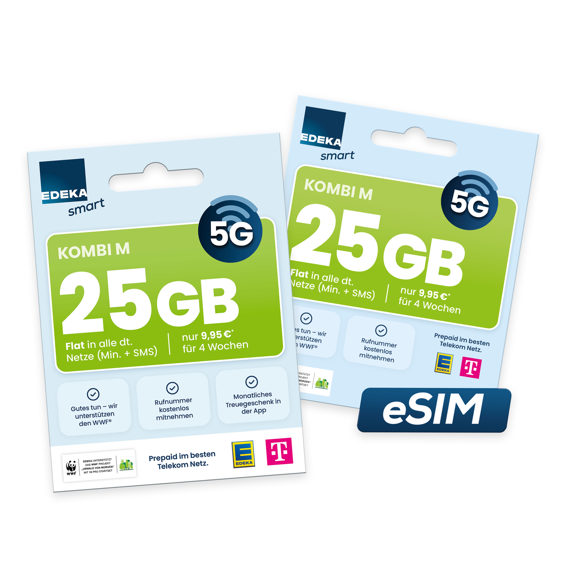 • EDEKA smart kombi XL kostet 19,95 € für 4 Wochen und enthält eine Telefon und SMS Flat in alle dt. Netze – jeweils auch im EU-Ausland ohne Zusatzkosten nutzbar. Mit 100 GB Highspeed-Volumen mit bis zu 100 Mbit/s und 5G (danach max. 32 KBit/s im Download und max. 16 KBit/s im Upload).