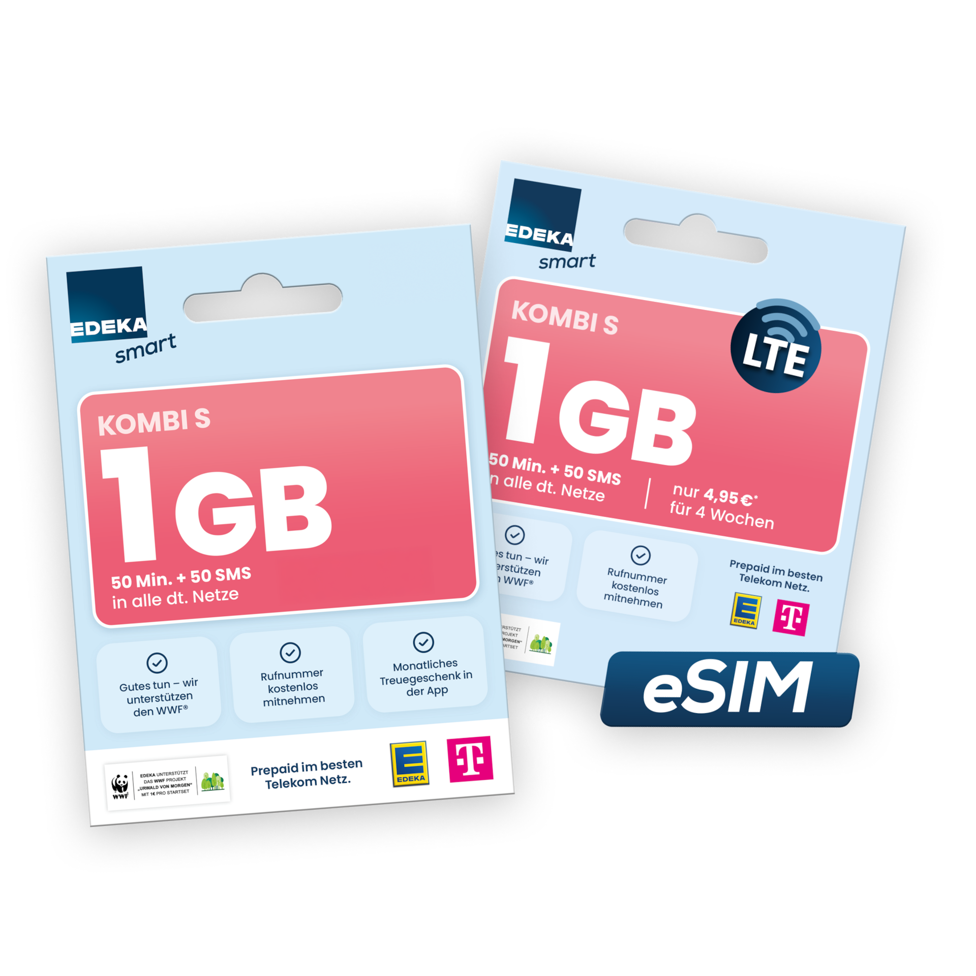 • EDEKA smart kombi S kostet 4,95€/4 Wochen und enthält 50 Min. und 50 SMS in alle dt. Netze sowie eine Telefon und SMS Flat ins Telekom Mobilfunknetz -jeweils auch im EU-Ausland ohne Zusatzkosten nutzbar.