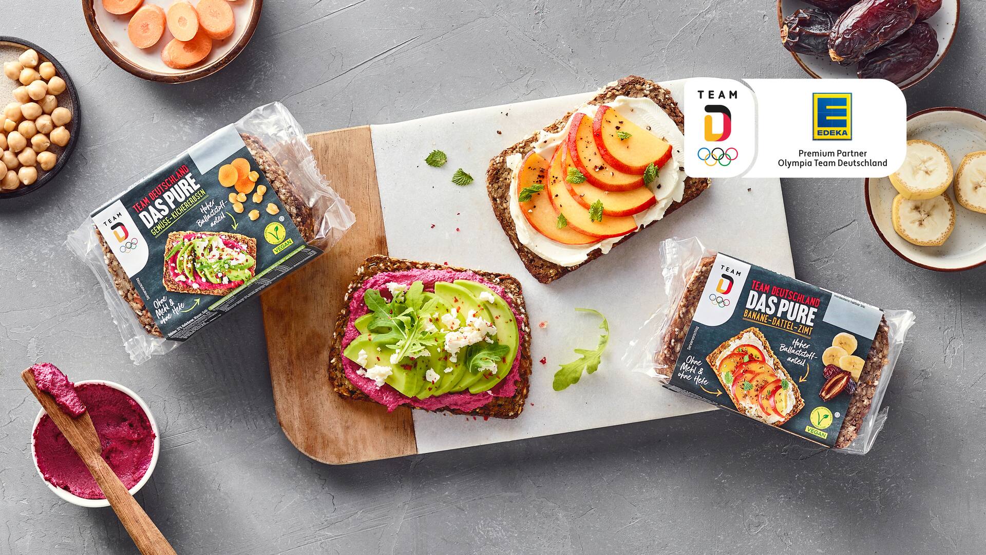 Es ist so weit: Die offiziellen Team Deutschland Brote sind ab sofort in allen teilnehmenden EDEKA-Märkten erhältlich. Und wieder heißt es: Für Sportler:innen. Für Fans. Für alle. Egal ob Gemüse-Kichererbsen oder Banane-Dattel-Zimt – es ist für jeden Geschmack was dabei.