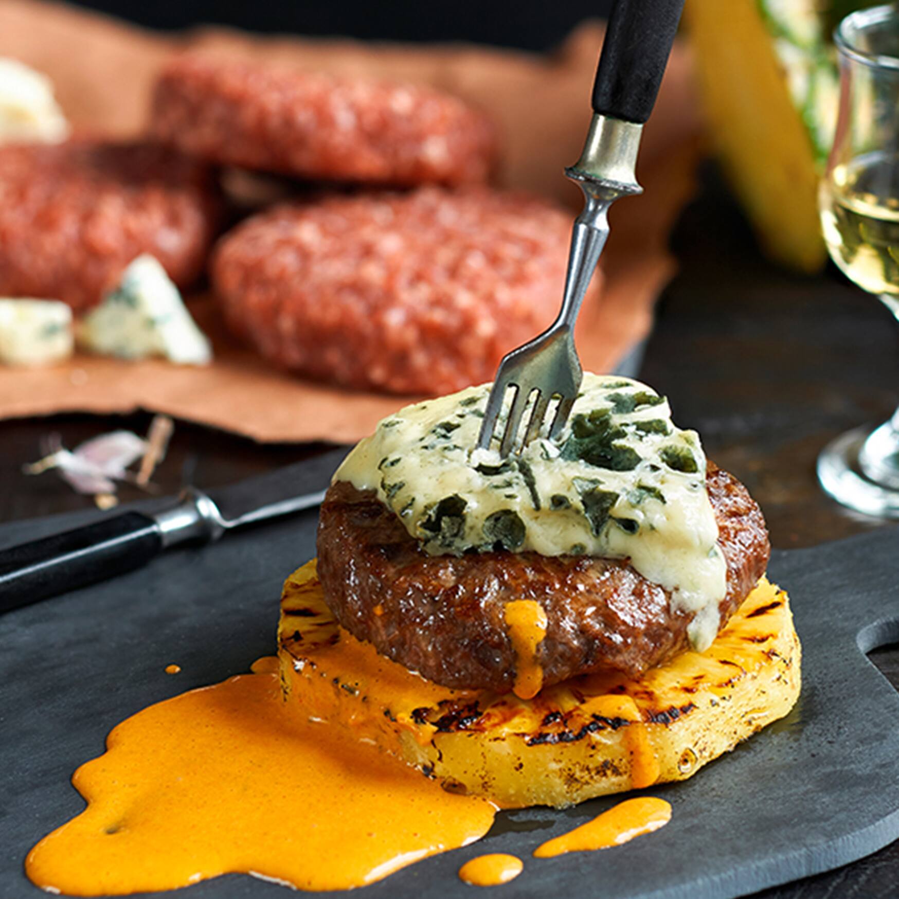 Tolles Rezept mit Bio-Rindfleisch: Burger Beef Edition vom Grill mit Ananas, Roquefort und Buttersauce