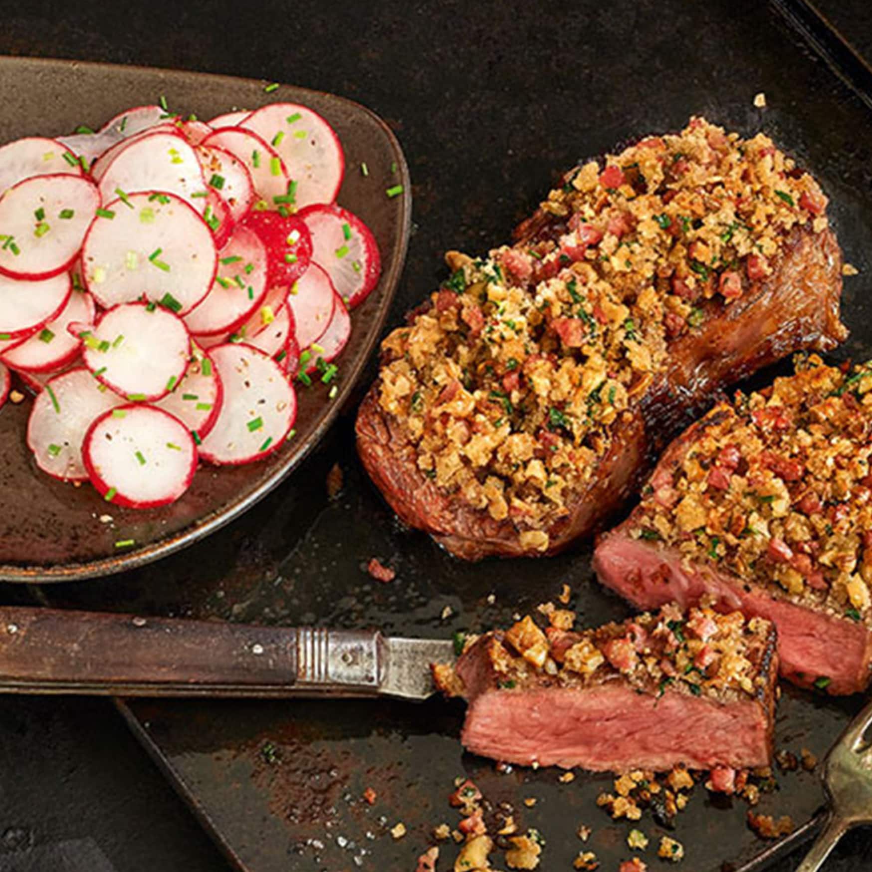 Tolles Rezept mit Bio-Rindfleisch: Rindersteak mit „Schwarzwälder Schinken“-Nuss-Kruste