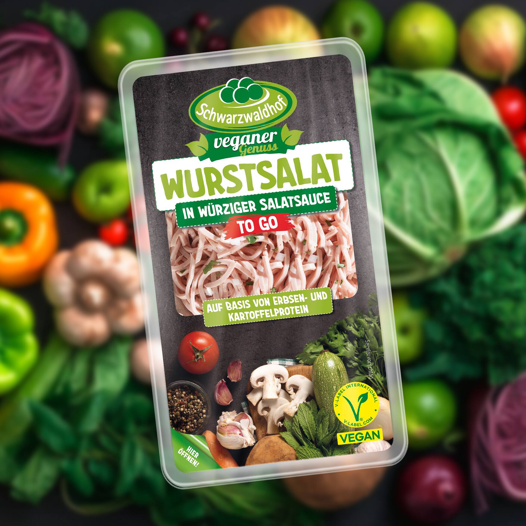 Schwarzwaldhof geht neue Wege: Zum Sortiment gehört seit Sommer 2023 ein veganer Wurstsalat in würziger Salatsauce. Dieser ist rein pflanzlich und wird auf Basis von Erbsen- und Kartoffelprotein hergestellt. Perfekt für unterwegs zum Beispiel als Proviant für die Wanderung oder für ein Picknick.