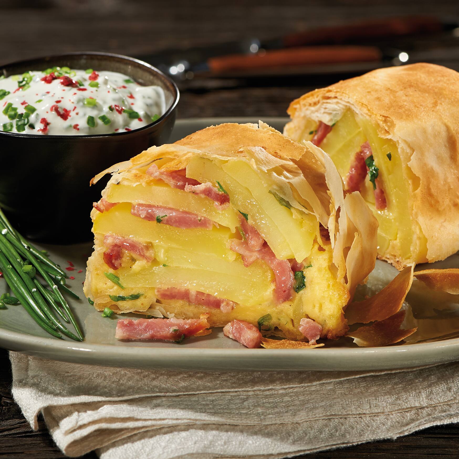Vorgegarte Kartoffeln und die roh geräucherten Schinkenstreifen von Schwarzwaldhof ergeben zusammen eine köstliche Strudel-Füllung. Dazu ein feiner Limetten-Schmand und schon haben Sie ein leckeres Mittag- oder Abendessen.