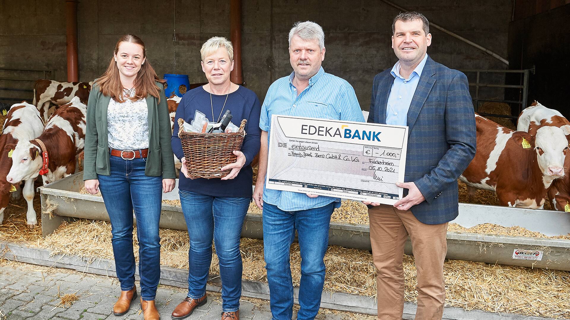 Der Kälber-Aufzuchtbetrieb von Familie Benz wurde 2021 mit dem Tierschutzpreis des Landes Baden-Württemberg ausgezeichnet. Ralf Engelhardt, Leiter Qualitätsmanagement EDEKA Südwest Fleisch (r.), und Katharina Gänger, Tierschutzbeauftragte EDEKA Südwest Fleisch (l.), gratulierten Franz-Josef Benz und seiner Frau Beate auf ihrem Hof und überreichten ihnen als weitere Anerkennung einen Scheck über 1.000 Euro. „Die Kälber werden von Familie Benz eng betreut, sodass sie deren Wohlergehen jederzeit im Blick haben“, erklärte Katharina Gänger. Wie die Kälber auf dem Betrieb aufwachsen, erfahren Sie hier.