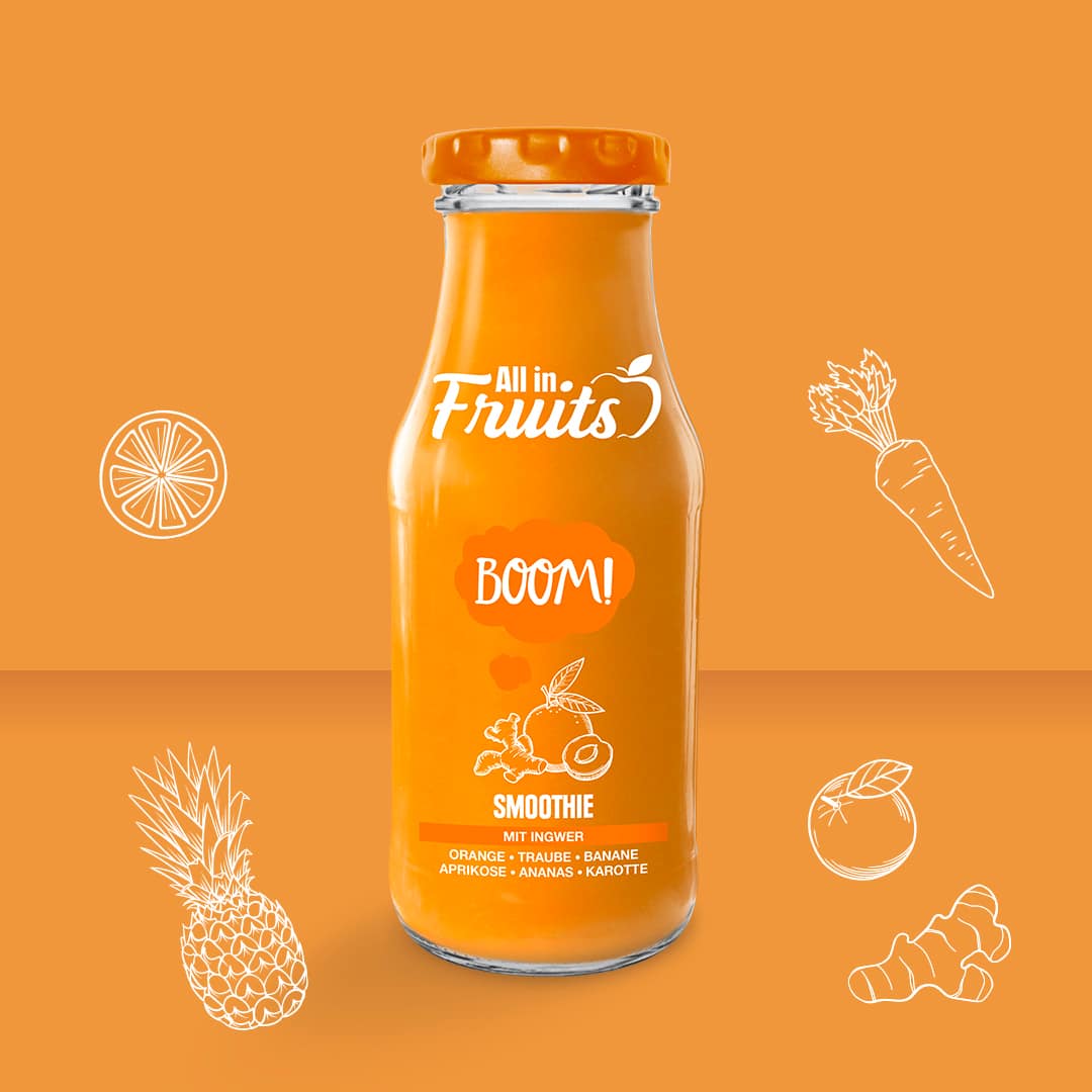 Eine fruchtige Kombination aus Orangen und Trauben mit einem feurigen Hauch von Ingwersaft. Banane, Aprikose, Ananas und Karotte sorgen nicht nur für die intensive Farbe, sondern machen den Geschmack boombastisch. Dieser Smoothie ist wie ein prickelndes Abenteuer für deine Geschmacksnerven! Mit 100% Fruchtanteil und der intensiven Ingwer-Würze sorgt der All in Fruits BOOM! nicht nur für Genuss, sondern auch für einen extra Kick. BOOM! Auf ins würzige Abenteuer!