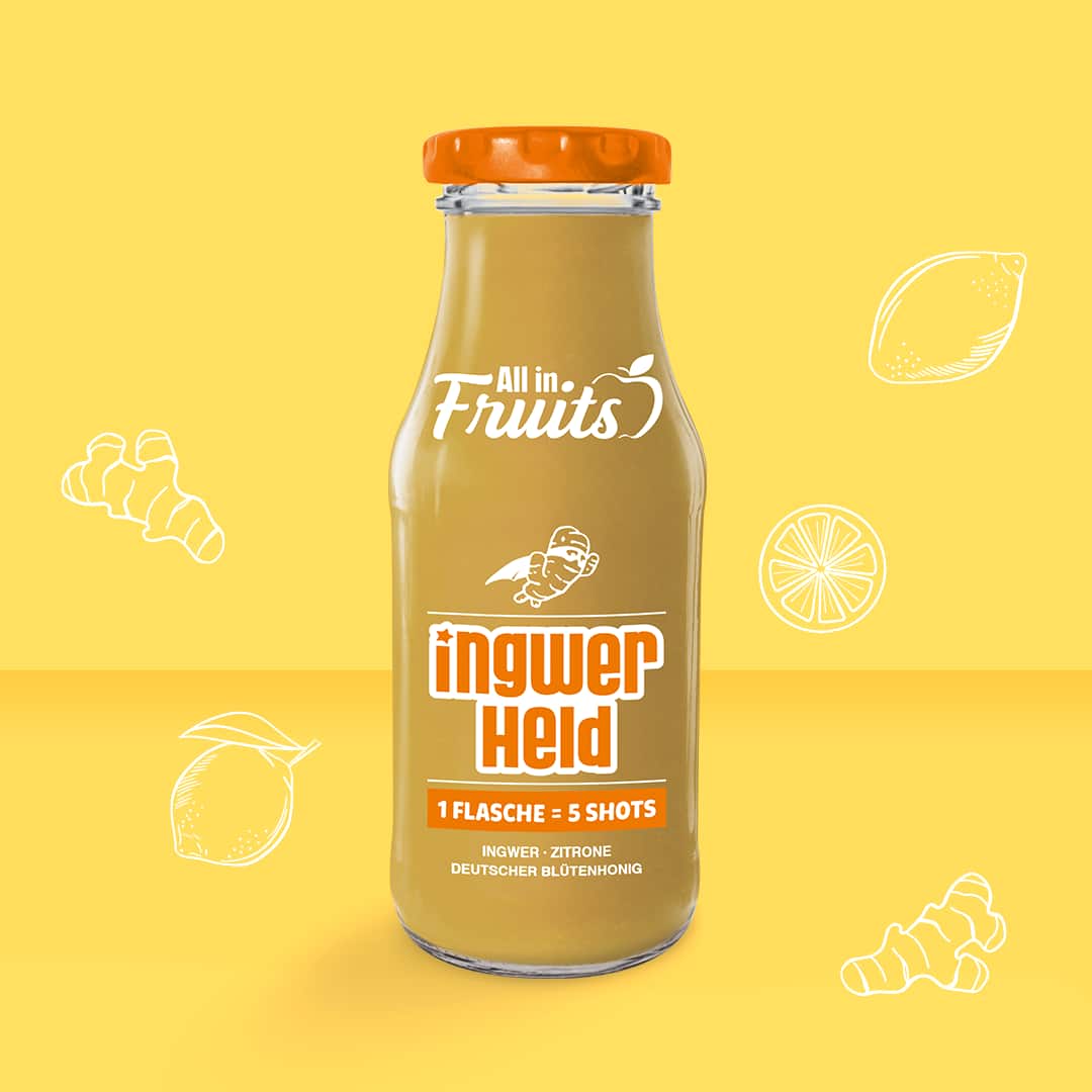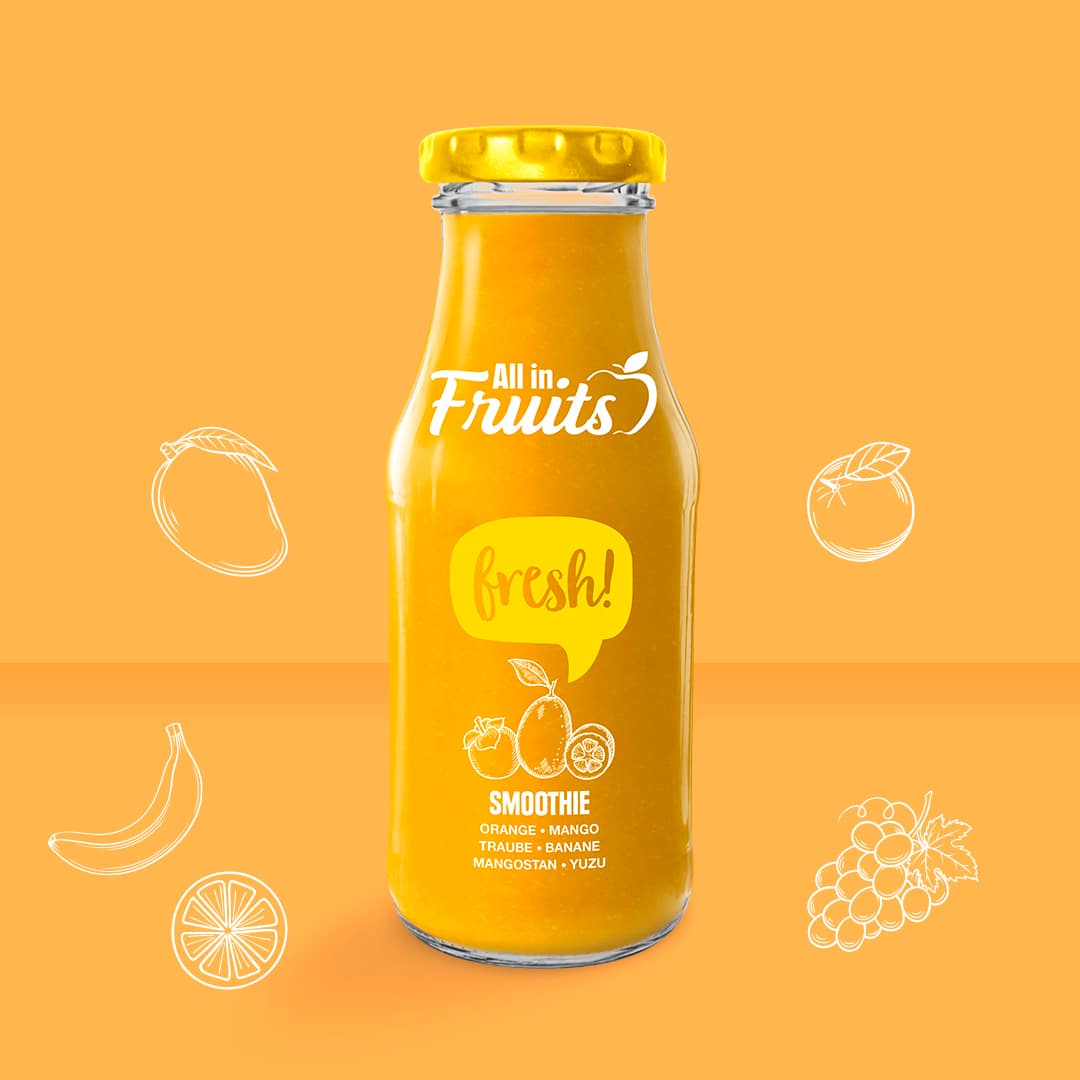 Entdecke All in Fruits in vier aufregenden Sorten – natürlich ohne Zuckerzusätze und Konservierungsstoffe, dafür aber bis zum Rand gefüllt mit 100 Prozent Fruchtanteil und wertvollen Superfoods. Und vor allem: Jeder Menge richtig gutem Geschmack in der wiederverwertbaren 250-ml-Glasflasche.