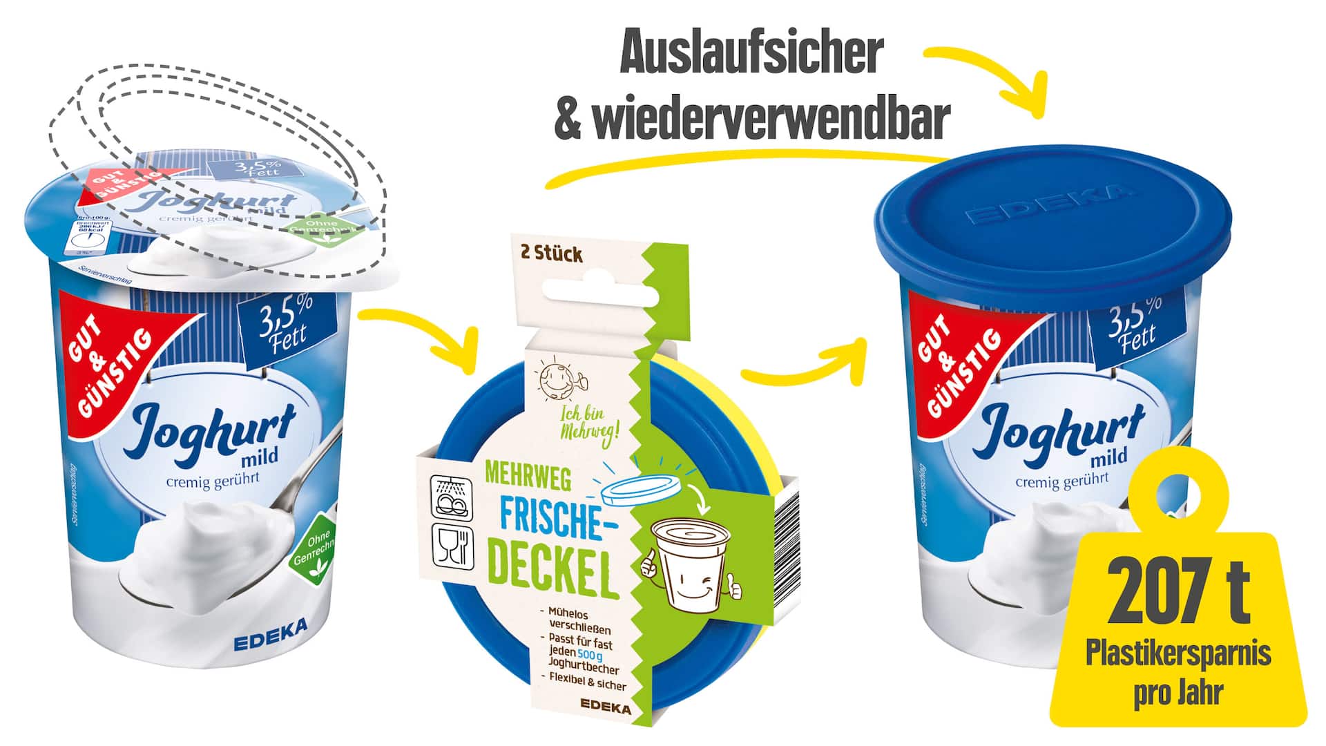 *Verzicht der Kunststoffdeckel auf allen EDEKA Joghurts, EDEKA Bio Joghurts, GUT & GÜNSTIG Joghurts und GUT & GÜNSTIG Skyr.
